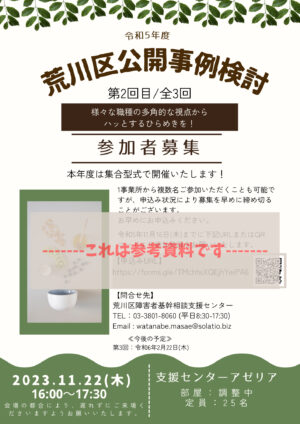 ひと月ほど前になりましたら、荒川区障害者福祉課を通じて参加者を募集いたしますので、ぜひ、参加登録のうえご参加下さい。