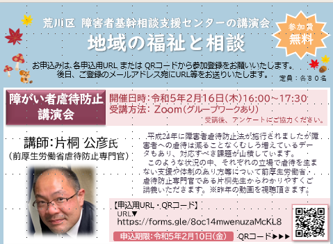 2023年2月、荒川区障がい者基幹相談支援センターのオンライン講演会「障がい者虐待防止講演会」を開催いたしました。