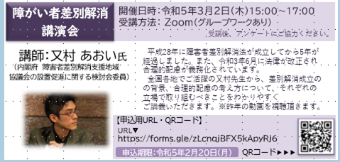 2023年3月、荒川障害者基幹相談支援センターのオンライン講演会「障がい者差別解消講演会」を開催いたしました。