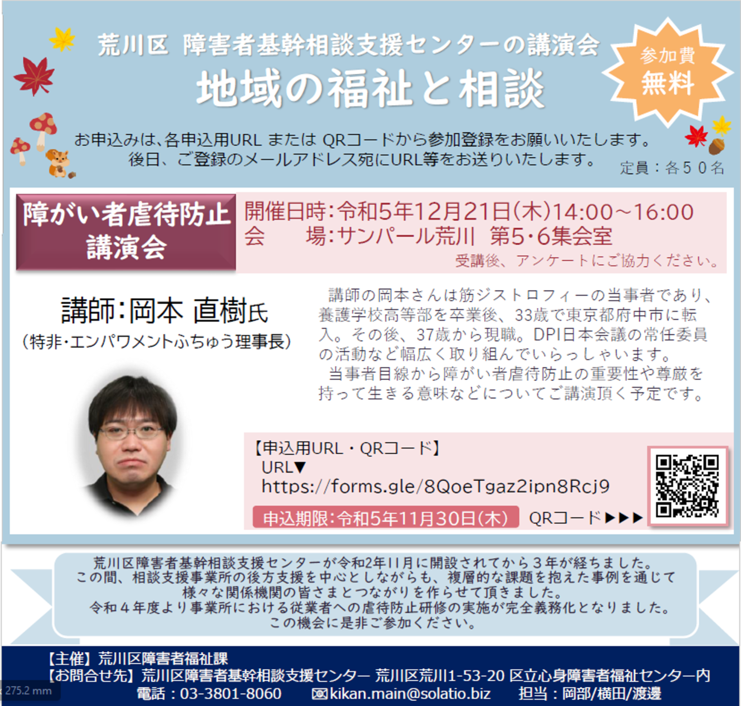 研修情報 令和5年度 障がい者虐待防止講演会のお知らせ 2023.11.14 Post Share Hatena Line RSS feedly Pin it note この記事のタイトルとURLをコピーする 荒川区障害者基幹相談支援センターによる、令和5年度の研修についてご案内いたします。 2023(令和5)年 12月21日(木)14時より、サンパール荒川にて障がい者虐待防止講演会を開催いたします。参加申込みにつきまして、荒川区障害者福祉課より各関係機関へご案内いただいております。令和4年度より事業所における従業者への虐待防止研修の実施が完全義務化となりましたので、ぜひこの機会にご参加ください。 申込フォームへのリンクはコチラです。(2023年11月30日(木)まで) Post Share Hatena Line RSS feedly Pin it note